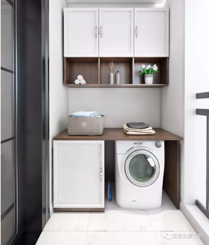 除了安放洗衣機和洗手盤,把陽臺變成一個洗衣房和洗漱區(qū)之外,陽臺的另一個作用就是安裝收納柜。