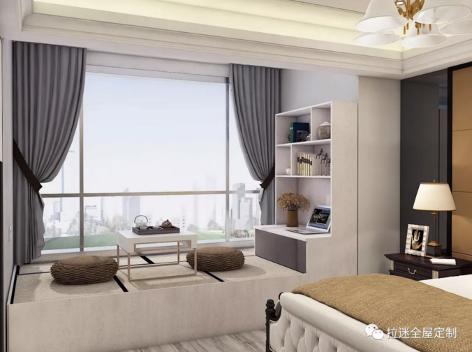 升降臺榻榻米是一個非常巧妙的創(chuàng)意,升起之后就是一張簡單的桌子,可以用于品茶、閱讀、下棋等休閑活動,沉降之后與榻榻米表面齊平,又瞬間變回了一張床,設計上簡約而不簡單 將榻榻米安排在窗戶旁邊,無形之中賦予其飄窗的性能,無論采光還是視野,都能達到極佳的效果。