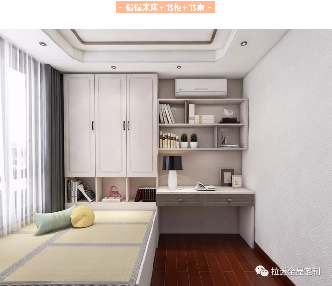 這種將【榻榻米床+衣柜+書架】結(jié)合在一起的設(shè)計方式,既能提供大量的儲物空間,又能創(chuàng)造個性與休閑的家居氛圍,美觀實用兩不誤!